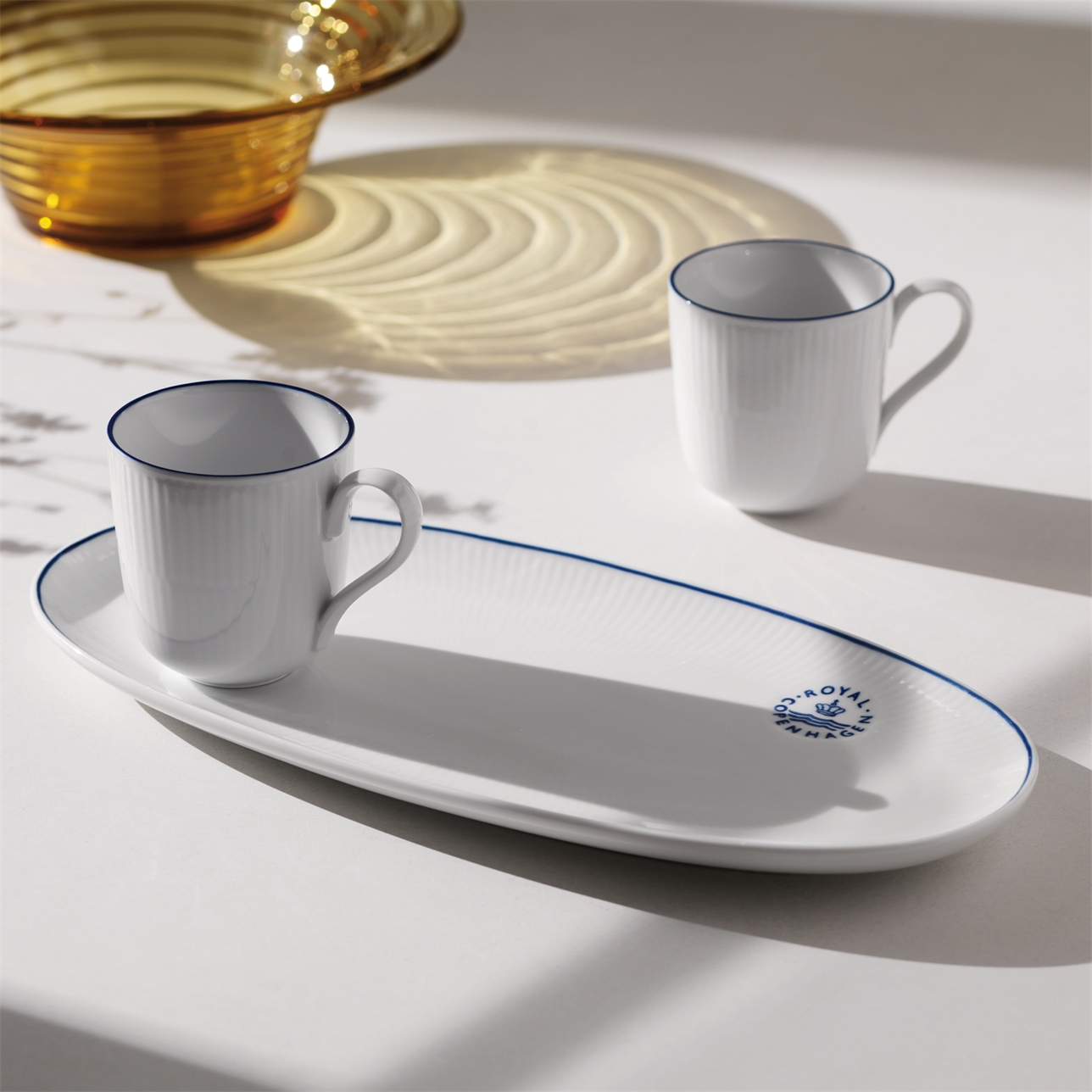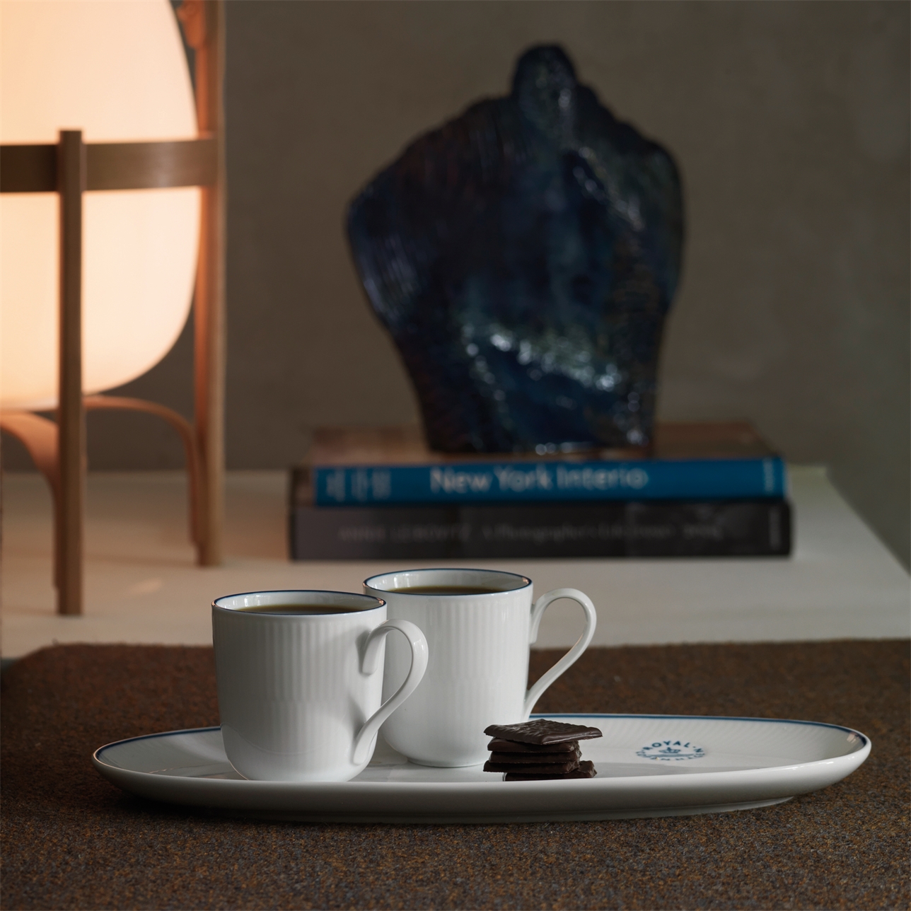 Blueline — это современный гимн скандинавскому минимализму. В центре внимания — безупречная белизна культовых каннелюр (желобков) Royal Copenhagen, подчеркнутая лишь одной тонкой синей линией, нанесенной вручную.