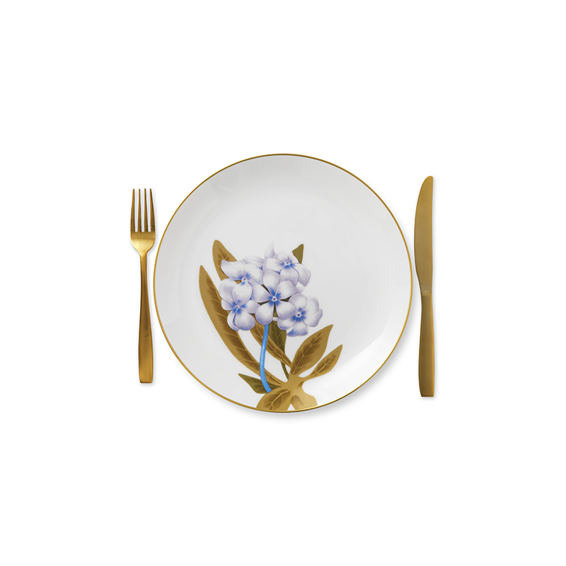 На этой тарелке рододендрон вырастает из середины тарелки, демонстрируя золотые листья и нежные лепестки в синих и сиреневых оттенках. Изящный флористический декор и золотой ободок — это нежная отсылка к культовой коллекции Flora Danica, привносящая в сервировку стола особую элегантность и утонченность.