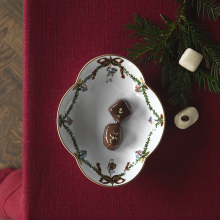 Блюдо Royal Copenhagen Star Fluted Christmas — это воплощение рождественского волшебства и праздничного уюта. Выполненное из изысканного костяного фарфора, это блюдо украшено яркими гирляндами из еловых веток, красными лентами, золотыми звездами и символичными рождественскими мотивами, создавая неповторимую атмосферу праздника.