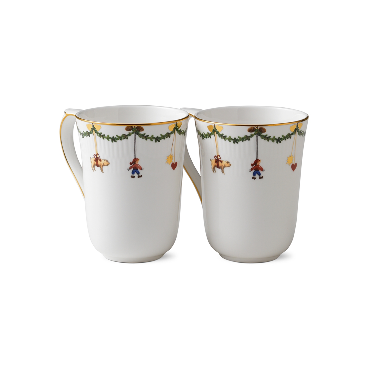 Набор Star Fluted Christmas от Royal Copenhagen — это элегантный и самодостаточный подарок, который принесет праздничное настроение в любой дом. В комплект входят две чашки, выполненные из тончайшего костяного фарфора. Они украшены традиционными еловыми гирляндами, рождественскими игрушками и изысканными золотыми деталями. Этот узор навевает тёплые воспоминания о датских рождественских традициях. Благодаря объему 360 мл чашки идеально подойдут для чаепития или кофе-брейка.