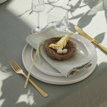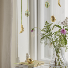 Созданное из нержавеющей стали с покрытием из 18-каратного золота, это украшение в форме невесомого пера придаст вашему пасхальному декору изысканную легкость. Входящее в коллекцию 2024 года, оно подвешено на элегантной зеленой ленте, символизируя обновление природы и атмосферу весеннего праздника.
