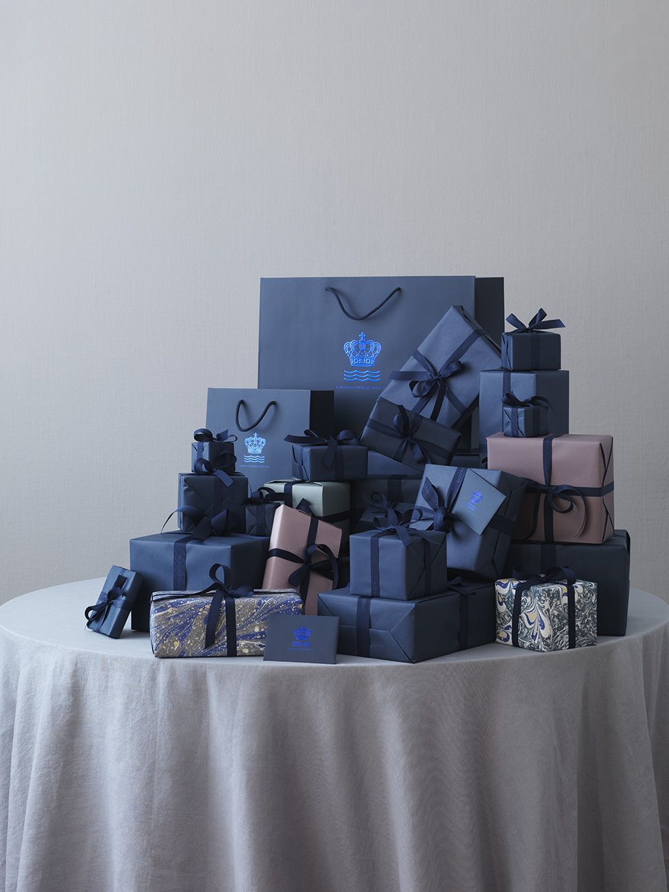 Брендированный темно-синий матовый пакет с синим или золотым логотипом Royal Copenhagen.