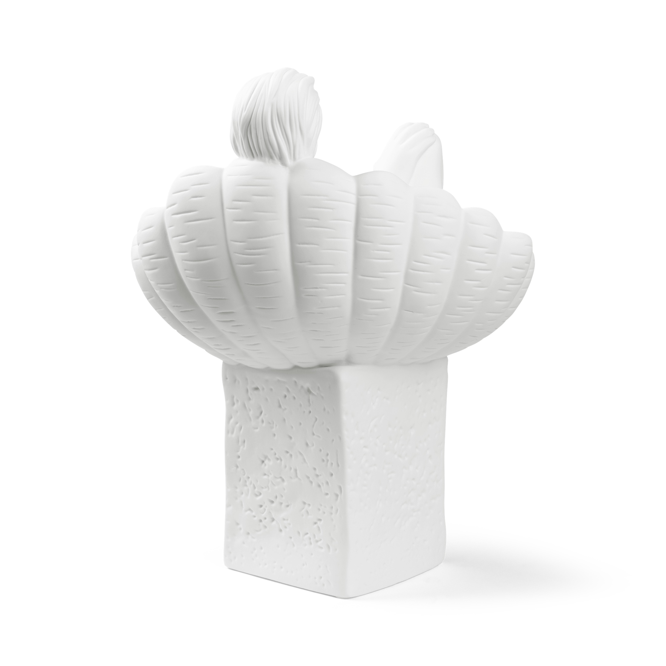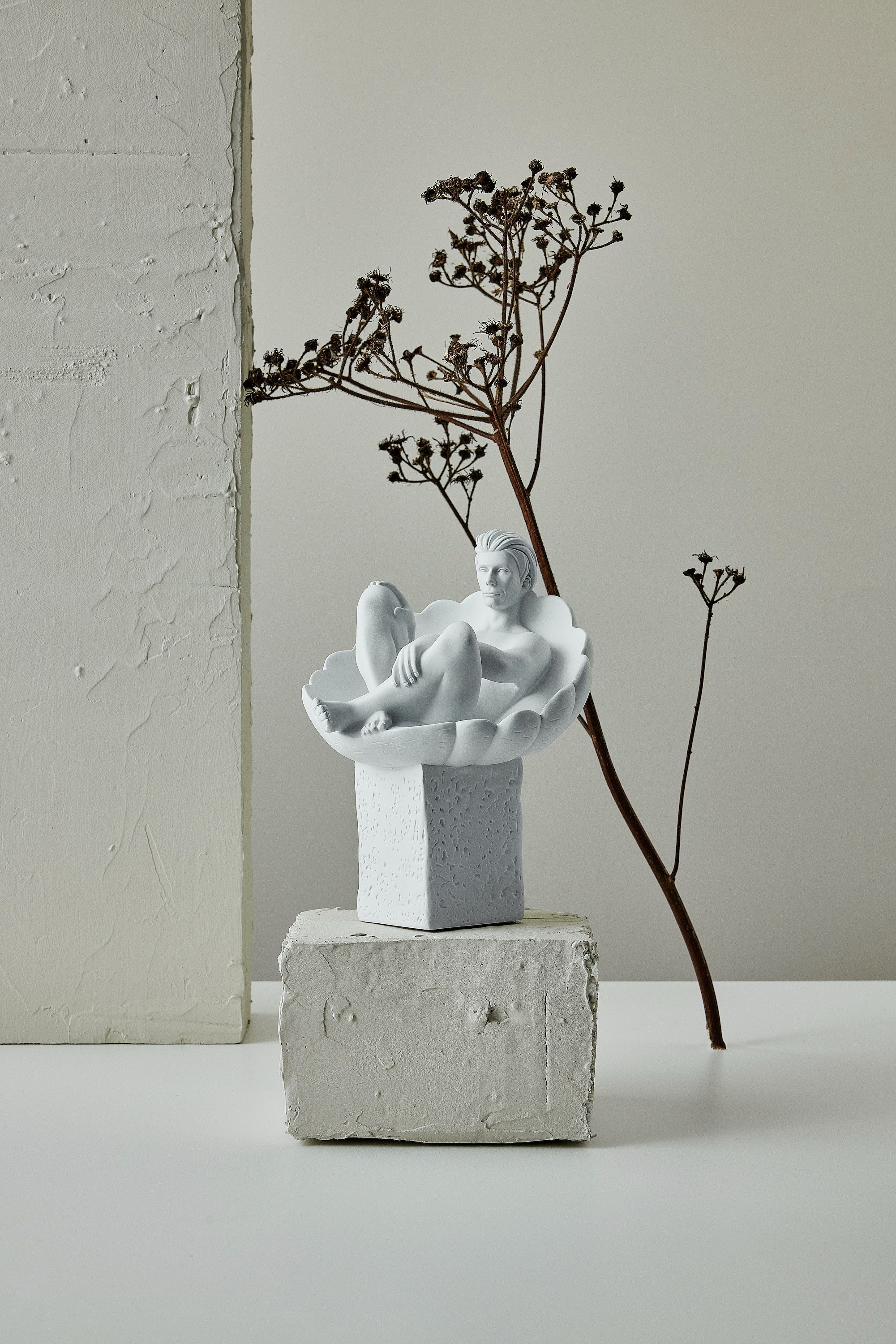 Скульптура выполнена из неглазурованного бисквитного фарфора. Его бархатистая, матовая текстура мягко рассеивает свет, акцентируя внимание на сложной пластике и чистоте линий. Отсутствие блеска придает работе современный вид и особую тактильную привлекательность.