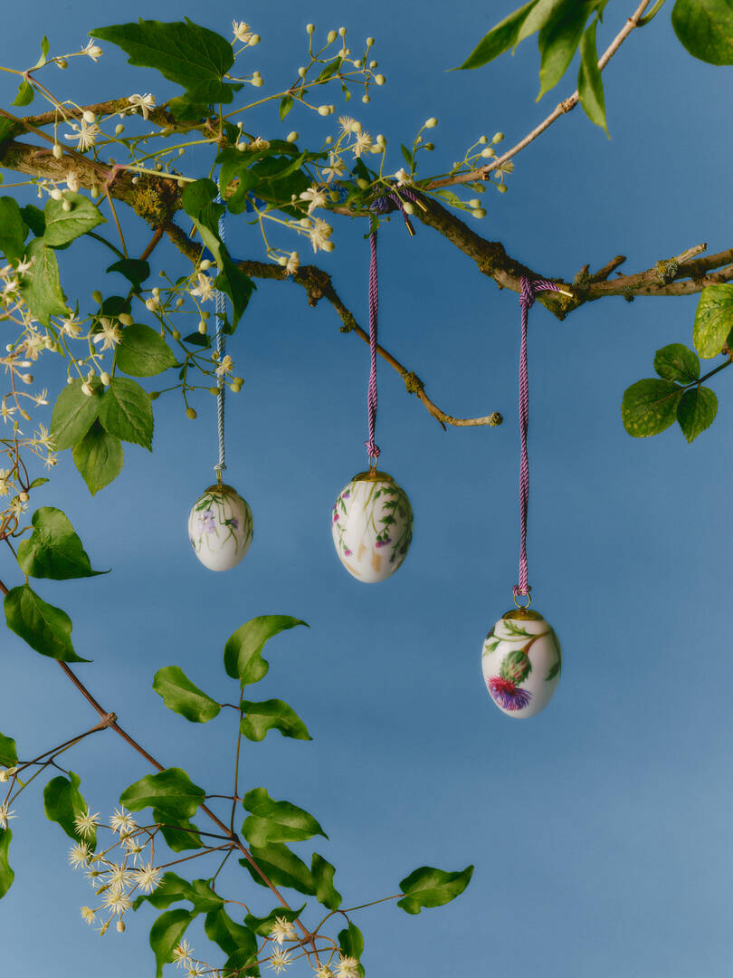 Детальное изображение цветка чертополоха на белоснежном фарфоре воспевает дикую и самобытную красоту весенней флоры. Подвесные яйца станут изысканным дополнением к пасхальному дереву из вербных ветвей или элегантным самостоятельным акцентом в интерьере.
